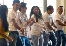 Laura Villalobos, left,Sei Kuwahara, Luiggi Bernales and Silvia Ardon giggle as they salsa dance during the 3rd annual Peru Fest on Saturday at the Utah Multicultural Center.