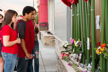 About 100 people gathered to pay homage to the young man of biracial parentage who police say lunged at them with a sword.