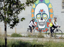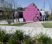 Sarah Lyman, left, communication manager for Salt Lake City, and Mayor Ralph Becker arrive on the walking-bicycling path for the grand opening of Utahís first ever multi-modal recreation corridor September 19 near the 600 East South S-Line crossing.