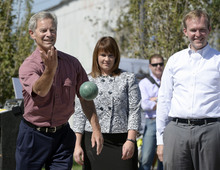 Salt Lake City Mayor Ralph Becker, left, South Salt Lake Mayor Cherie Wood and Salt Lake County Mayor Ben McAdams, mark the completion of Utah's first ever multi-modal recreation corridor thowing out the first bocce balls during a Grand Opening September 19 near the 600 East crossing.
