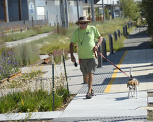 Man walks his dog along the greenway path for the grand opening of Utah's first ever multi-modal recreation corridor September 19 near the 600 East South S-Line crossing.