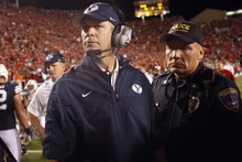 Andy Phillips boots the ball out of the end zone. BYU takes over at its own 25 and marches 60 yards to the Ute 15, mostly on Taysom Hill keepers and bootlegs. On a key third-and-8 at midfield, though, Hill drills a 17-yard bullet to Jordan Leslie, a better pass than any he threw in last year's game at LES. On first down at the 15, two Cougar offensive linemen are called for holding on the same play, followed by an illegal-formation call, then, by a personal-foul penalty, and, Bronco Mendenhall's car is towed for being illegally parked, all killing the drive and taking BYU out of field-goal range.