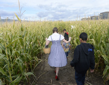 Brothers Wesley, Daniel, and Marcus Haston take a stroll around Cornbelly's Pumpkin Festival with "Dorothy and the "Tinman." The state's original corn maze returns to Cornbelly's at Thanksgiving Point for its 19th season on Oct. 3. The 8-acre maze pays tribute to the 75th anniversary of the "Wizard of Oz" movie