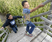 Brothers Marcus and Wesley Haston hike to the top a viewing tower at the state's original corn maze. It returns to Cornbelly's at Thanksgiving Point for its 19th season on Oct. 3. The 8-acre maze pays tribute to the 75th anniversary of the "Wizard of Oz" movie