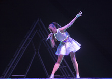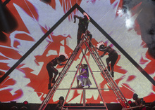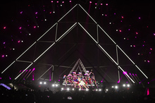 The show featured pyrotechnics, rainbow-colored lights dancing across the arena, acrobats hanging from a pyramid above the floor and a stage that moved vertically and horizontally in different spots.