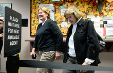 The first same-sex couple in Salt Lake County to seek a marriage license after the Supreme Court's decision were two women, Kelli Frame and Suzanne Marelius. They've been together for five years. As the clerk pulled up the form on a computer screen, Frame put her arm around Marelius.