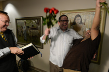 State Sen. Jim Dabakis, D-Salt Lake City, who is openly gay and married his husband in December, hugged the two women in congratulation.