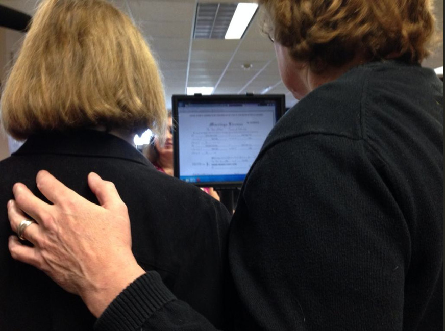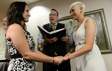 Sheri Ault, left, and her partner of 18 years, Leslie McWilliams, are married by Reverend Heron (Tara Sudweeks Willgues) moments after getting their marriage license at the Salt Lake County Complex on Monday. The U.S. Supreme Court declined to review all five pending same-sex marriage cases on Monday, Oct. 6, 2014 effectively legalizing gay and lesbian unions, clearing the way for such marriages to proceed in 11 new states - including Utah.
