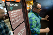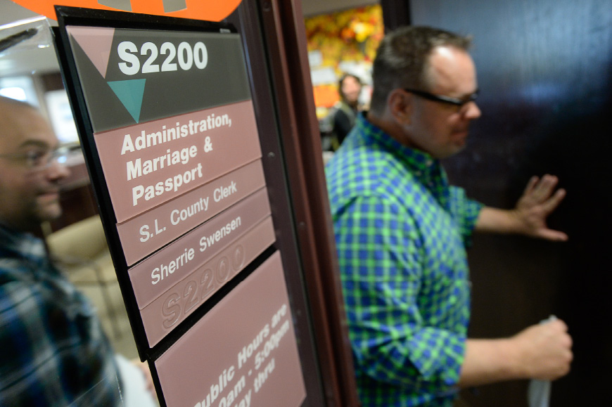 Jason McDermaid, left, and Zachary Smallwood, who have been together for eight years, fill out a marriage license at the Salt Lake County Complex, becoming the second same-sex couple to show up on Monday morning. The U.S. Supreme Court declined to review all five pending same-sex marriage cases on Monday, Oct. 6, 2014 effectively legalizing gay and lesbian unions, clearing the way for such marriages to proceed in 11 new states - including Utah.
