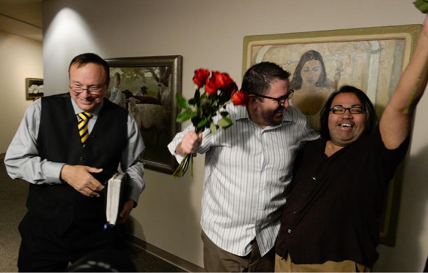 Elated about the U.S. Supreme Court declining to hear appeals from five states trying to revive their same-sex marriage bans, effectively legalizing gay and lesbian union in 11 new states, Derek Kitchen carries friend and fellow plaintiff Kody Partridge to the elevators as his partner Moudi Sbeity and Partirdge's wife, Laurie Wood, laugh following a press conference at Magleby and Greenwood law offices in Salt Lake City, Monday, October 6, 2014.