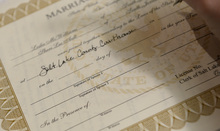 A same-sex couple fills in their marriage certificate that reads Spouse 1 and Spouse 2 on Monday at the Salt Lake County Complex on Monday. The U.S. Supreme Court declined to review all five pending same-sex marriage cases on Monday, Oct. 6, 2014 effectively legalizing gay and lesbian unions, clearing the way for such marriages to proceed in 11 new states - including Utah.