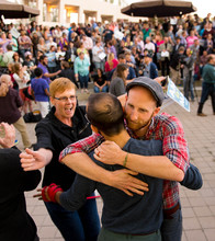 Kody Partridge twirled her wife Laurie Wood to celebratory music broadcast over Library Square. Patridge and Wood were one of the three couples who were plaintiffs in the case.