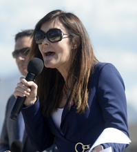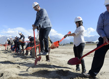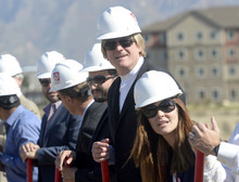 Overstock.com CEO Patrick Byrne, center, and President Stormy Simon, right, get ready to dig in for the company's ground breaking of a $100 million campus that it is calling the ìPeace Coliseum,î which will cover 230,793 square feet. It will look like a peace sign from overhead and the Roman Colosseum from the ground. The parcel is on the northwest corner of the property at 7200 S. 900 West