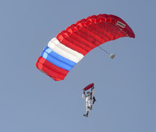 Overstock.com CEO Patrick Byrne decends by parachute from 18,000 feet for the company's grou