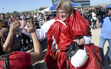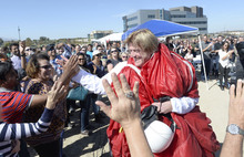 Overstock.com CEO Patrick Byrne (still wrapped in his parachute from a drop of 18,000 feet) high fives employees for the company's ground breaking of a $100 million campus that it is calling the ìPeace Coliseum,î which will cover 230,793 square feet. It will look like a peace sign from overhead and the Roman Colosseum from the ground. The parcel is on the northwest corner of the property at 7200 S. 900 West