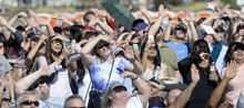 Overstock.com employees shade their eyes from the direct sun to see Overstock.com CEO Patrick Byrne's decent by parachute from 18,000 feet to the site for the company's ground breaking for a $100 million campus that it is calling the "Peace Coliseum," which will cover 230,793 square feet. It will look like a peace sign from overhead and the Roman Colosseum from the ground. The parcel is on the northwest corner of the property at 7200 S. 900 West