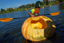 Racers at the 4th Annual Ginormous Pumpkin Regatta in Sugar House Park, Salt Lake City, Saturday October 18, 2014.
