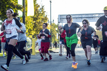 Zombies Faith Hilton, Emily Butler, Ruth Evans and Lucy Hill chase humans Kristy Deans, left, and Lauren Vail during the Dawn of the Running Dead 5K race at the Utah State Fairpark on Saturday.