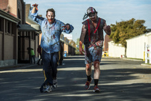 Zombies Cameron Romine, of Eagle Mountain, and Tyler Lloyd, of South Jordan, chase down humans during the Dawn of the Running Dead 5K race at the Utah State Fairpark Saturday October 18, 2014.