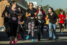 Zombies Faith Hilton, Emily Butler, Ruth Evans and Lucy Hill chase humans Kristy Deans, left, and Lauren Vail during the Dawn of the Running Dead 5K race at the Utah State Fairpark Saturday October 18, 2014.