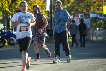 Zombies Tyler Lloyd, of South Jordan, and Cameron Romine, of Eagle Mountain, run during the Dawn of the Running Dead 5K race at the Utah State Fairpark Saturday October 18, 2014.